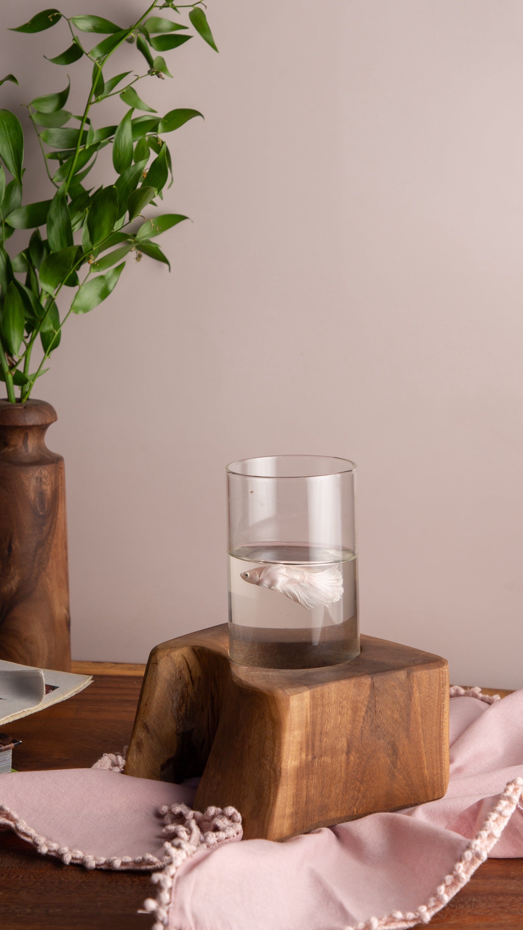 حوض سمك مكون من قاعدة خشبية وحوض زجاجي وسمكة الموضحه بالصورة